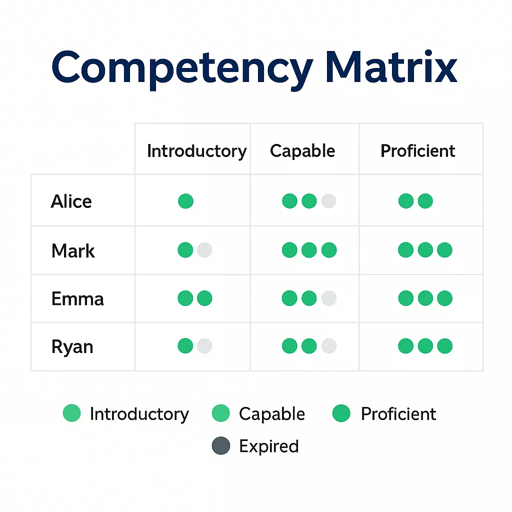 It is a widely used tool for visually presenting an overall scenario of employees’ training needs in either a simple table or digital dashboard—it maps employees against the required skills, certifications, or particular sources they must complete.